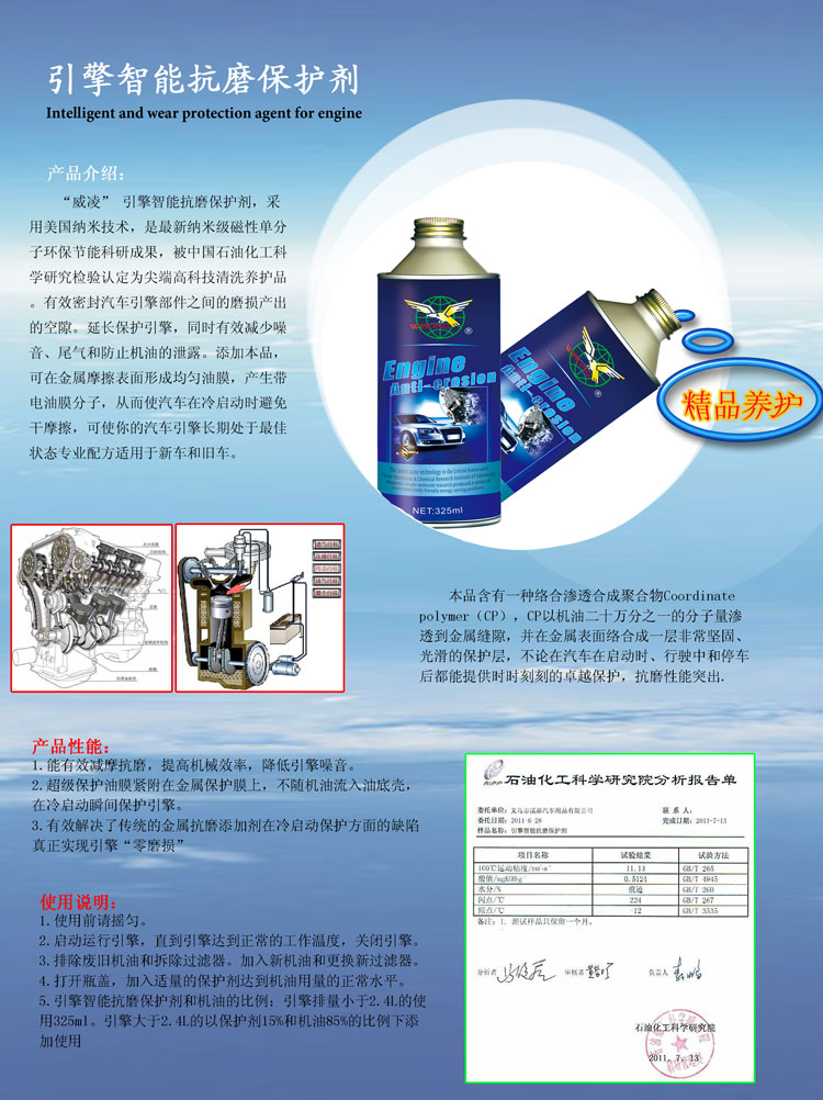 "Weiling"Intelligent and wear protection agent, the U.S. nano-technology, nano-magnetic single-molecule latest environmentally friendly energy research, scientific tests by China Petroleum & Chemical identified as cutting-edge high-tech cleaning maintenance products. , an effective seal between the wear of engine parts output gap. To extend the protection of the engine, while effectively reducing the noise, exhaust and to prevent oil leakage. Add this product can be uniform in the metal friction surface film, resulting in charged film molecules, so that the car in the cold start to avoid the dry friction, can make your car engine in the best long-term status. Specially formulated for new and used cars.
