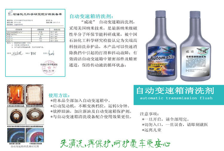 "Weiling"Automatic transmission cleaning agent, the U.S. nano-technology, nano-magnetic single-molecule latest environmentally friendly energy research, scientific tests by China Petroleum & Chemical identified as cutting-edge high-tech cleaning maintenance products. this shift in the product can quickly eliminate jitter caused by the slip and failure;close and effective cleaning in automatic transmission components and precision channel,keeping therecycle of fluidtransmission.